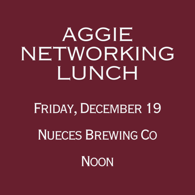 Aggie Networking Luncheons are a great way to network with other Aggies of industry in the Coastal Bend. Bring your business cards and join us for a lunch meet-up held quarterly! The location changes each quarter, so be sure to check back here or our social media pages for updated information.